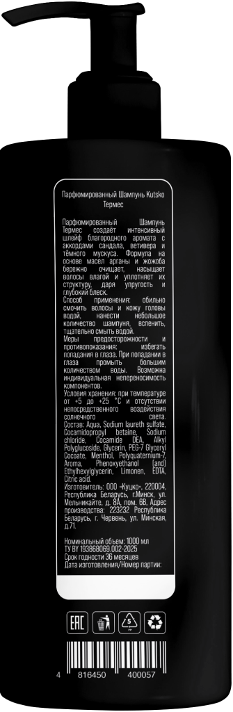 Создаёт интенсивный шлейф благородного аромата с аккордами сандала, ветивера и тёмного мускуса. Формула на основе масел арганы и жожоба бережно очищает, насыщает волосы влагой и уплотняет их структуру, даря упругость и глубокий блеск.